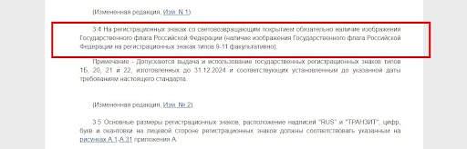 В вышеуказанном ГОСТе имеется пункт 3.4, согласно которому с 1 января 2025 года на регистрационном номера автомобиля в обязательном порядке должен быть флаг РФ.