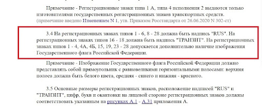 Пункт 3.4. : «На регистрационных знаках типов 1-6, 8-28 должна быть надпись "RUS". На регистрационных знаках типов 16-18 должна быть надпись "ТРАНЗИТ". На регистрационных знаках типов 1-4, 4А, 4Б, 15, 19, 23-28 допускается дополнительно наличие изображения Государственного флага Российской Федерации.»